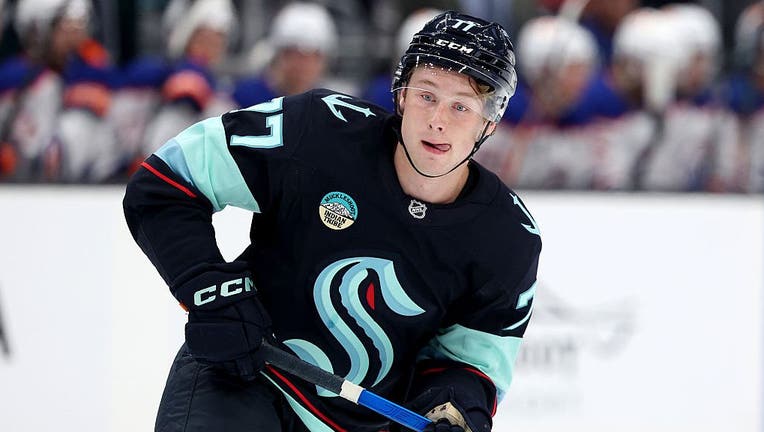 SEATTLE, WASHINGTON - OCTOBER 01: Berkly Catton #77 of the Seattle Kraken skates during the first period against the Edmonton Oilers in a preseason game at Climate Pledge Arena on October 01, 2025 in Seattle, Washington. (Steph Chambers / Getty Images)