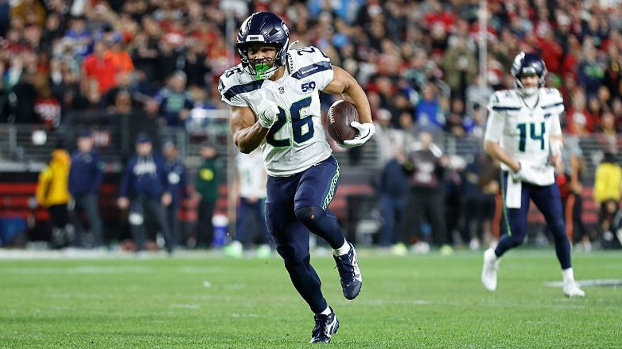 SANTA CLARA, CALIFORNIA - JANUARY 03: Zach Charbonnet #26 of the Seattle Seahawks runs the ball in the first quarter against the San Francisco 49ers at Levi's Stadium on January 03, 2026 in Santa Clara, California. (Lachlan Cunningham / Getty Images)