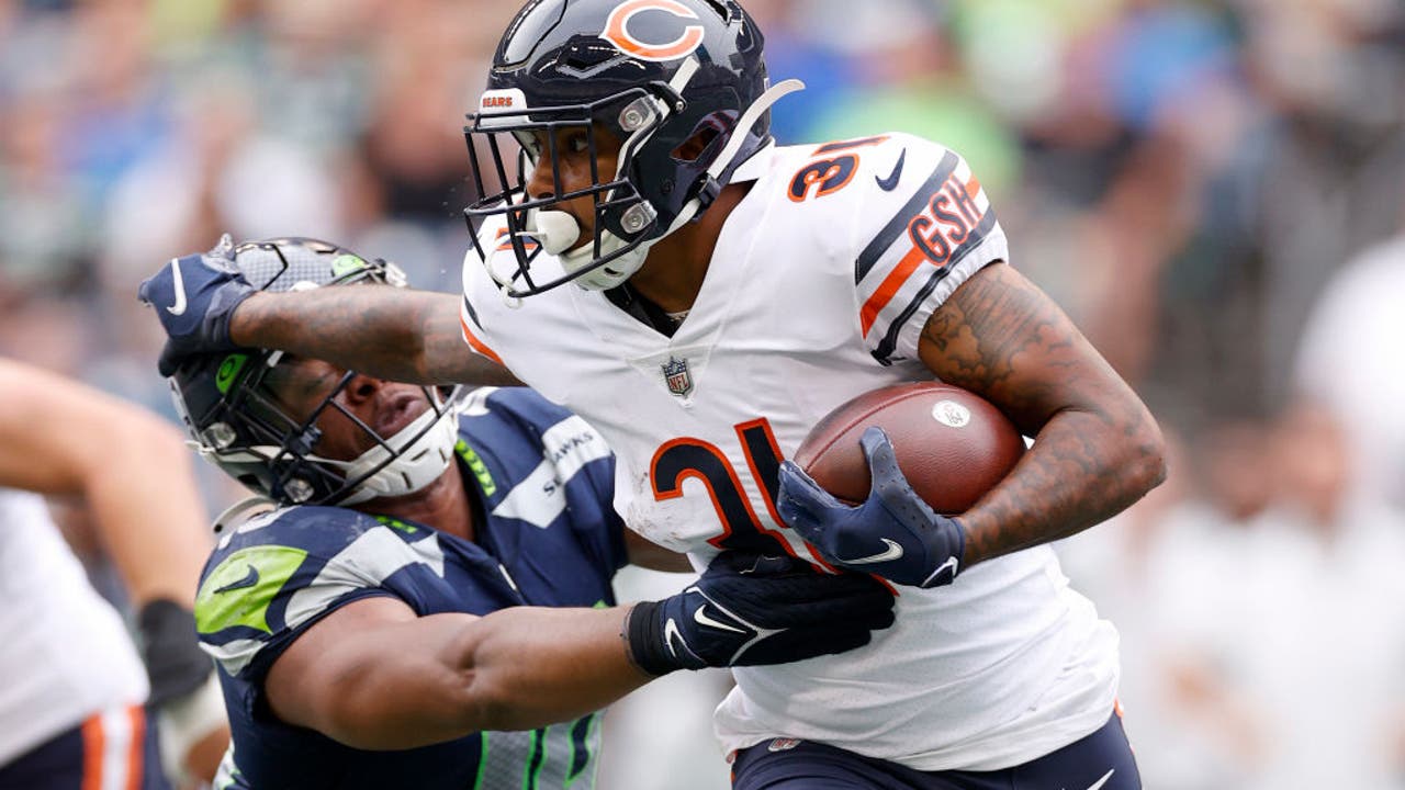 SEATTLE, WASHINGTON - AUGUST 18: Trestan Ebner #31 of the Chicago Bears stiff-arms Uchenna Nwosu #10 of the Seattle Seahawks in the first quarter at Lumen Field on August 18, 2022 in Seattle, Washington. (Photo by Steph Chambers/Getty Images)