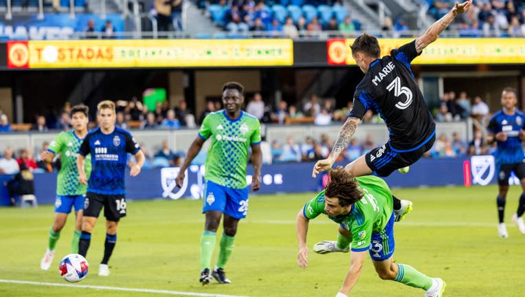 SAN JOSE, CA - JULY 12: San Jose Earthquakes defender Paul Marie (3) makes an acrobatic shot over the back of Seattle Sounders defender Cody Baker (33) during the MLS men's professional soccer game between the Seattle Sounders and San Jose Earthquake