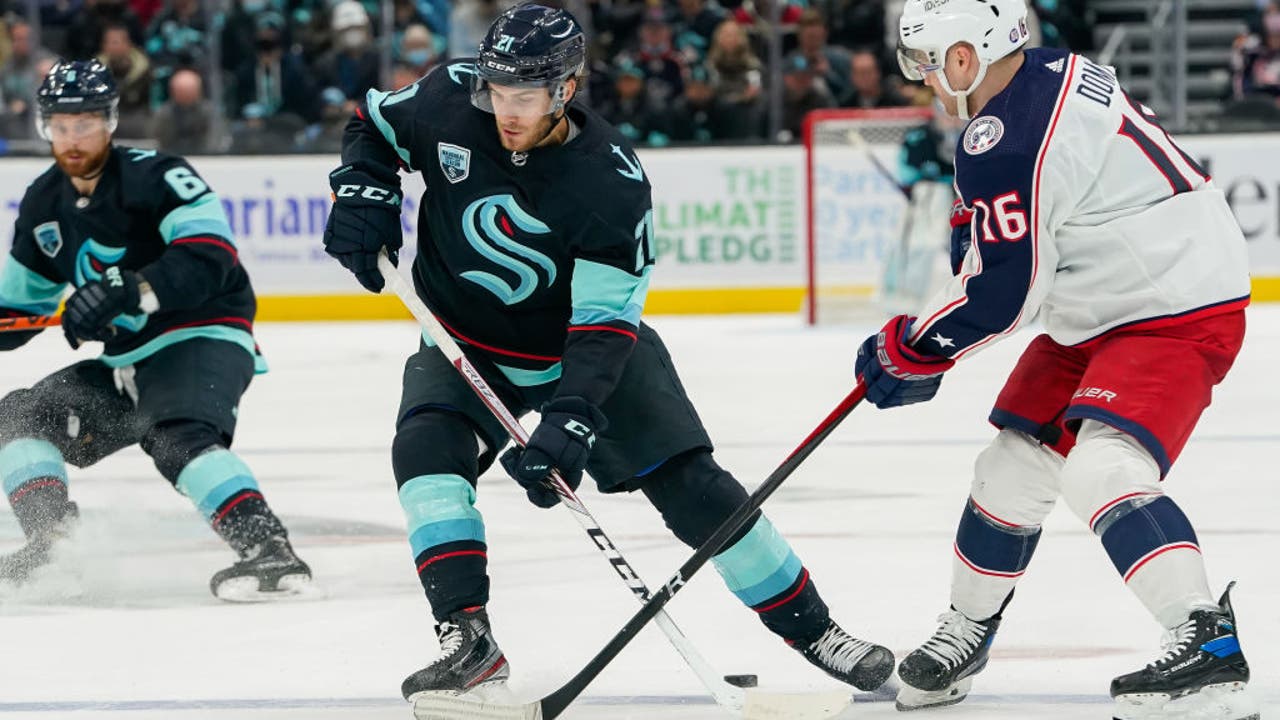 Seattle scored twice 22 seconds apart early in the third, with Jaden Schwartz deflecting Joonas Donskoi’s shot past Merzlikins at 3:41 and moments later Morgan Geekie snapped a wrist shot off a pass from Mason Appleton to pull Seattle within 4-3.