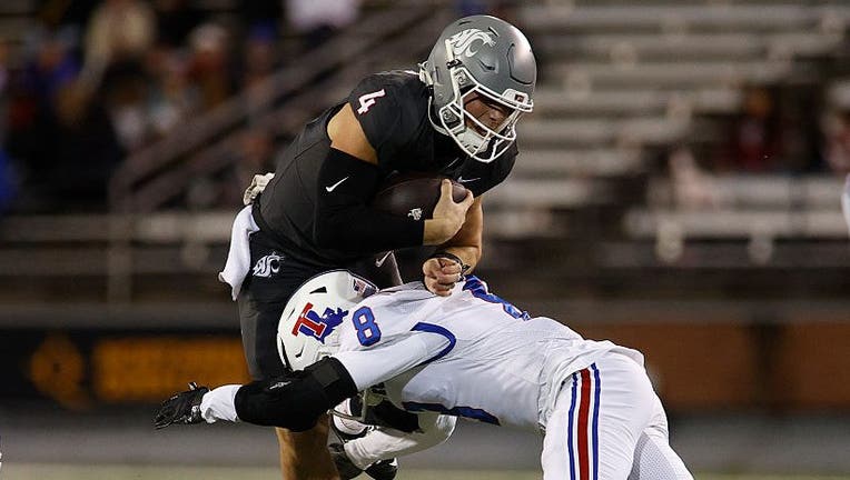 PULLMAN, WA - NOVEMBER 15: Washington State Cougars quarterback Zevi Eckhaus (4) is tackled by Louisiana Tech Bulldogs defensive back Jacob Fields (8) during the game between the Louisiana Tech Bulldogs and the Washington State Cougars on November 15 (Oliver McKenna / Icon Sportswire / Getty Images)