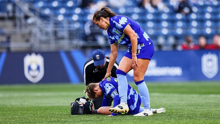 SEATTLE, WASHINGTON - APRIL 26: Sofia Huerta #11 of the Seattle Reign FC checks on an injured Jess Fishlock #10 of the Seattle Reign FC during the second half at Lumen Field on April 26, 2026 in Seattle, Washington. (Blake Dahlin / ISI Photos / Getty Images)