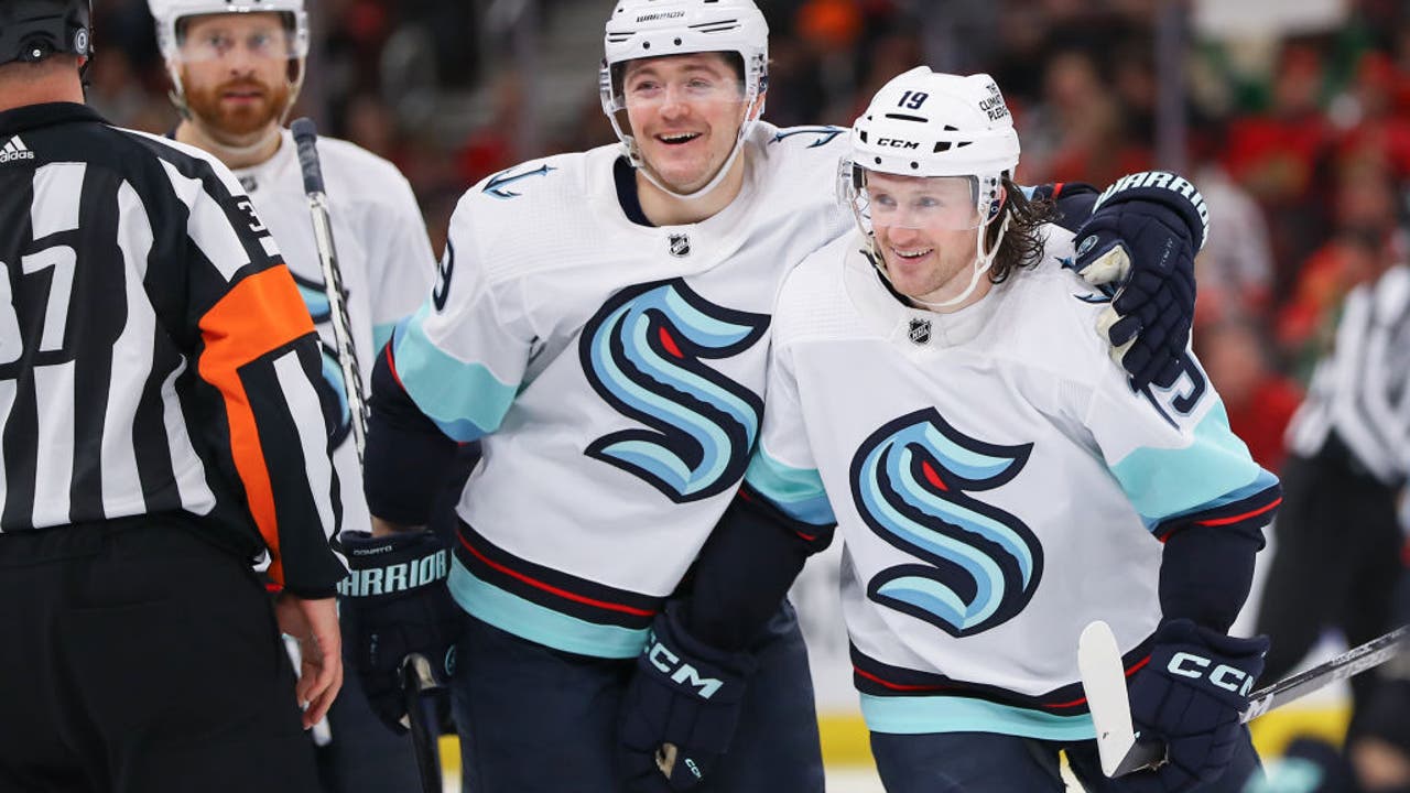CHICAGO, IL - JANUARY 14: Seattle Kraken Winger Jared McCann (19) is greets by Seattle Kraken Center Ryan Donato (9) after scoring a goal during a game between the Seattle Kraken and the Chicago Blackhawks on January 14, 2023 at the United Center in