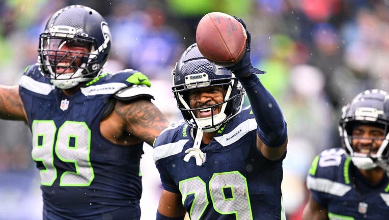 SEATTLE, WASHINGTON - OCTOBER 27: Josh Jobe #29 of the Seattle Seahawks celebrates with teammates after an interception during the second quarter against the Buffalo Bills at Lumen Field on October 27, 2024 in Seattle, Washington. (Jane Gershovich / Getty Images)