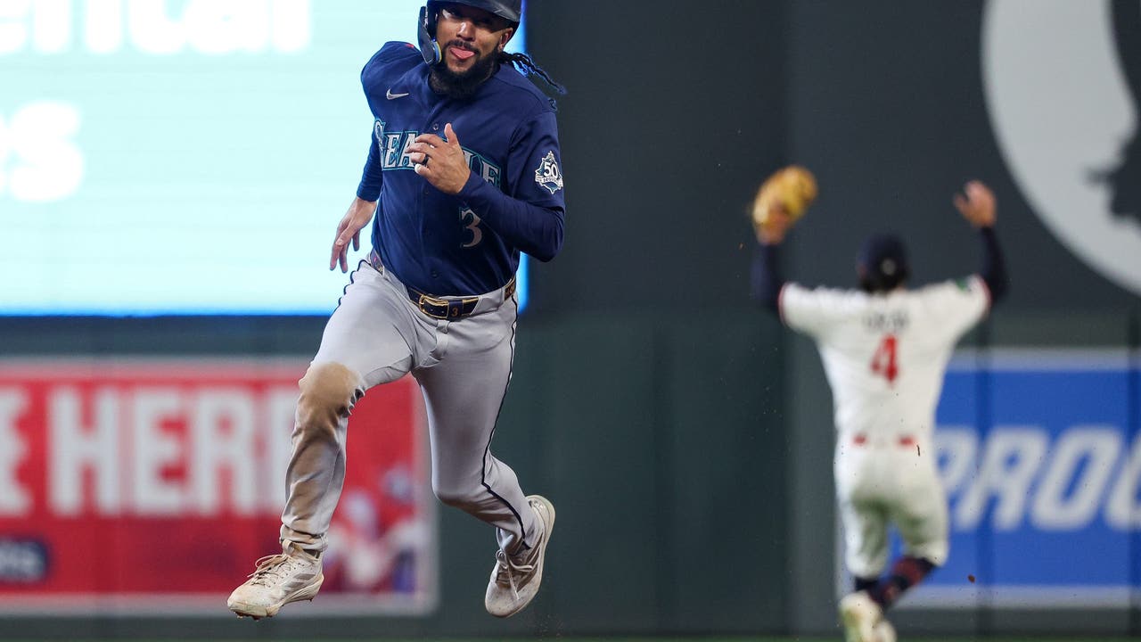 Seattle Mariners' J.P. Crawford advances to third base on a double hit by Julio Rodríguez during the eighth inning of a baseball game against the Minnesota Twins, Tuesday, April 28, 2026, in Minneapolis. (AP Photo/Matt Krohn)