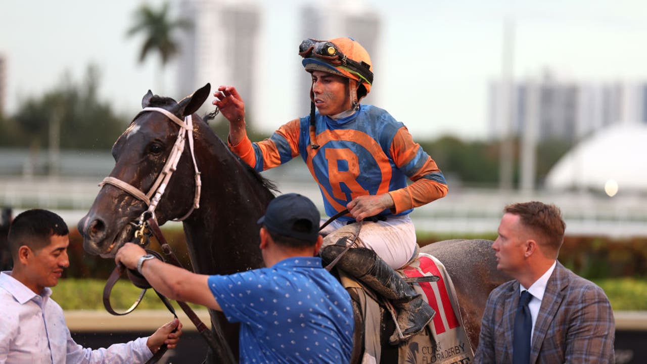 Forte #11, ridden by Irad Ortiz Jr. celebrates after winning the Florida Derby at Gulfstream Park on April 01, 2023 in Hallandale, Florida. (Photo by Al Bello/Getty Images)