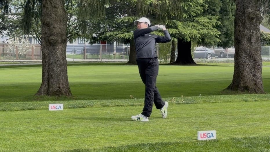 Texas senior Lauren Kim of Surrey, B.C. tees off on the 18th hole at Rainier Golf & Country Club in the U.S. Women's Open qualifier on April 28, 2026 (Curtis Crabtree / FOX 13 Seattle)