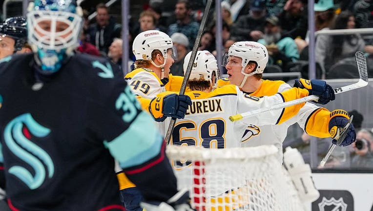 SEATTLE, WASHINGTON - MARCH 10: Reid Schaefer #49 of the Nashville Predators celebrates with teammates after scoring a goal during the second period of a game against the Seattle Kraken at Climate Pledge Arena on March 10, 2026 in Seattle, Washington (Christopher Mast / NHLI / Getty Images)