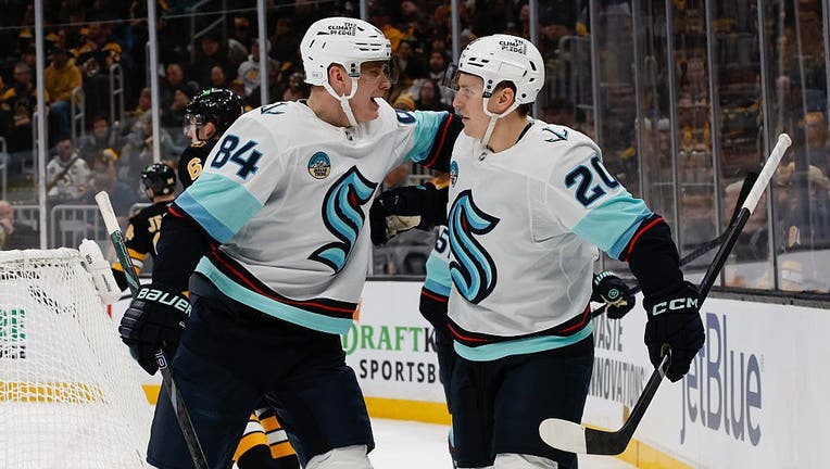 BOSTON, MASSACHUSETTS - JANUARY 15: Eeli Tolvanen #20 of the Seattle Kraken celebrates his goal against the Boston Bruins during the second period with teammate Kaapo Kakko #84 at the TD Garden on January 15, 2026 in Boston, Massachusetts. (Rich Gagnon / Getty Images)