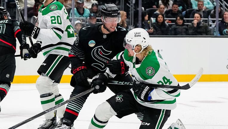 SEATTLE, WASHINGTON - NOVEMBER 26: Vince Dunn #29 of the Seattle Kraken clashes with Roope Hintz #24 of the Dallas Stars during the second period of a game at Climate Pledge Arena on November 26, 2025 in Seattle, Washington. (Liv Lyons / NHLI / Getty Images)