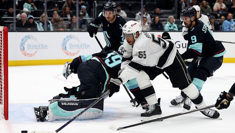 SEATTLE, WASHINGTON - APRIL 13: Quinton Byfield #55 of the Los Angeles Kings reaches for the puck against Nikke Kokko #39 of the Seattle Kraken during the first period at Climate Pledge Arena on April 13, 2026 in Seattle, Washington. (Steph Chambers / Getty Images)