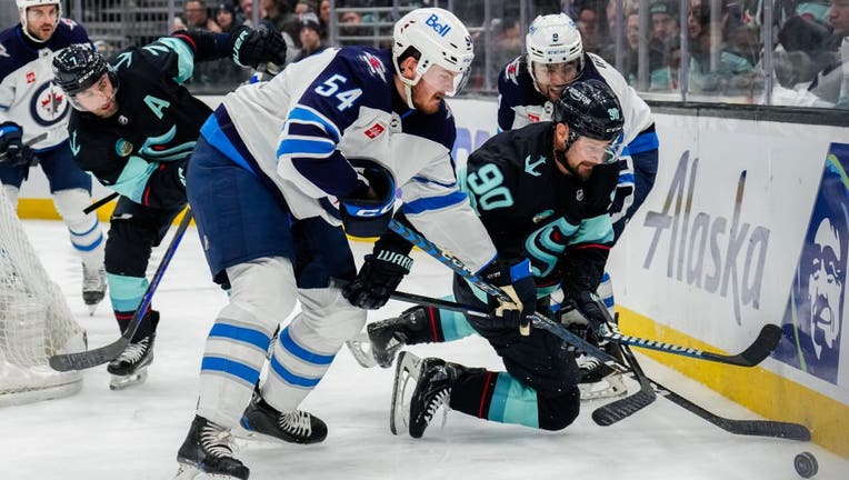 SEATTLE, WASHINGTON - MARCH 08: Dylan Samberg #54 and Brenden Dillon #5 of the Winnipeg Jets clash with Tomas Tatar #90 of the Seattle Kraken during the third period of a game at Climate Pledge Arena on March 8, 2024 in Seattle, Washington. (Photo by Christopher Mast/NHLI via Getty Images / Getty Images)