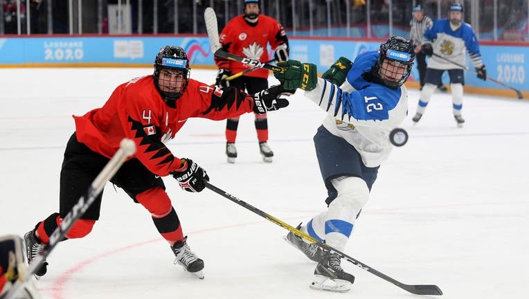 LAUSANNE, SWITZERLAND - JANUARY 22: Jani Nyman of Finland is challenged by Denton Mateychuk of Canada during the Men's 6-Team Ice Hockey Tournament Finals Bronze Medal Game between Canada and Finland on day 13 of the Lausanne 2020 Winter Youth Olympi
