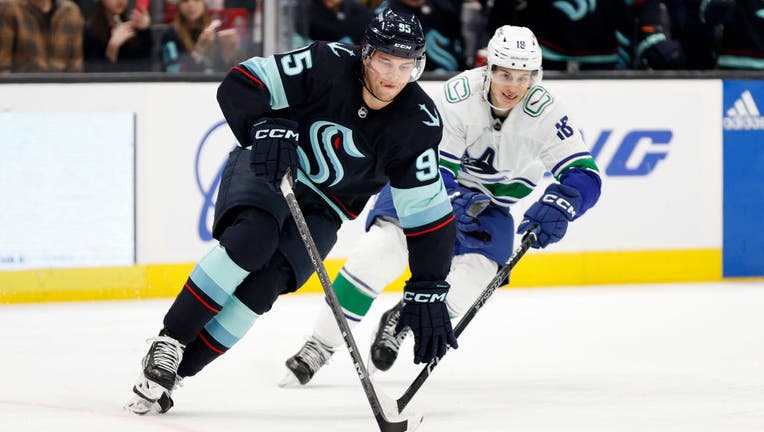 SEATTLE, WASHINGTON - JANUARY 25: Andre Burakovsky #95 of the Seattle Kraken skates against Jack Studnicka #18 of the Vancouver Canucks during the third period at Climate Pledge Arena on January 25, 2023 in Seattle, Washington. (Photo by Steph Chambe