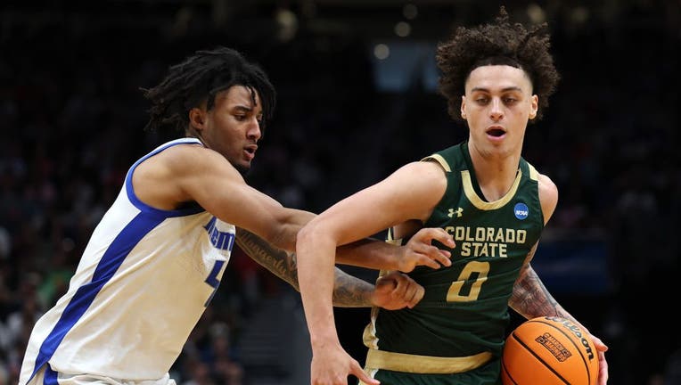SEATTLE, WASHINGTON - MARCH 21: Kyan Evans #0 of the Colorado State Rams dribbles the ball against PJ Haggerty #4 of the Memphis Tigers during the second half in the first round of the NCAA Men's Basketball Tournament at Climate Pledge Arena on March (Steph Chambers / Getty Images)