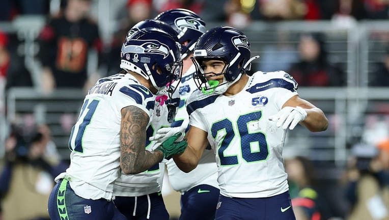 SANTA CLARA, CALIFORNIA - JANUARY 03: Zach Charbonnet #26 celebrates with Jaxon Smith-Njigba #11 of the Seattle Seahawks after scoring a touchdown against the San Francisco 49ers during the first quarter of a game at Levi's Stadium on January 03, 202 (Ezra Shaw / Getty Images)