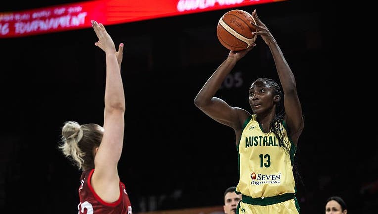 ISTANBUL, TURKEY - MARCH 14: Ezi Magbegor of Australia goes up for a shot during the Women's World Cup 2026 Qualifier between Australia and Hungary at the Turkcell Basketball Development Center on March 14, 2026 in Istanbul, Turkey. (Milad Payami / FIBA / Getty Images)