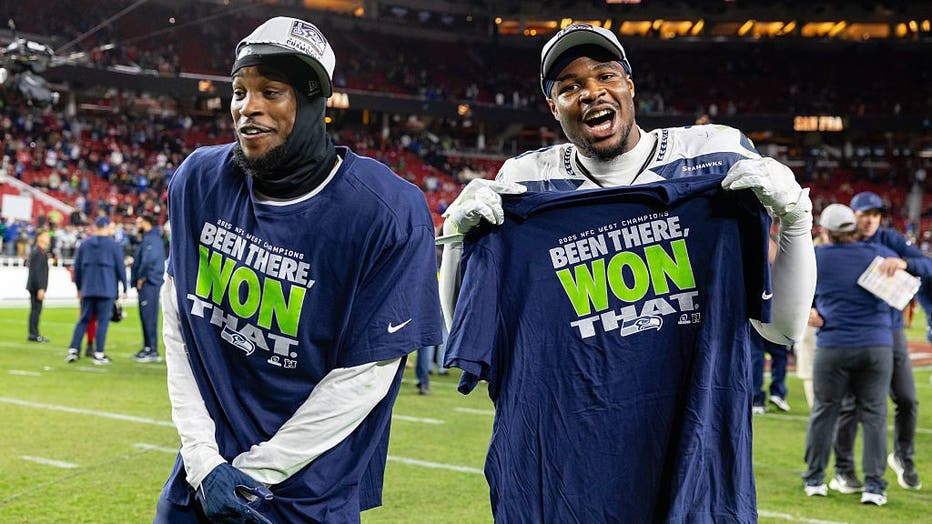 SANTA CLARA, CA - JANUARY 03: Nick Emmanwori #3 and Devon Witherspoon #21 of the Seattle Seahawks celebrates winning the NFC West after an NFL game against the San Francisco 49ers on January 3, 2026 at Levi's Stadium in Santa Clara, CA. (Matthew Huang / Icon Sportswire / Getty Images)