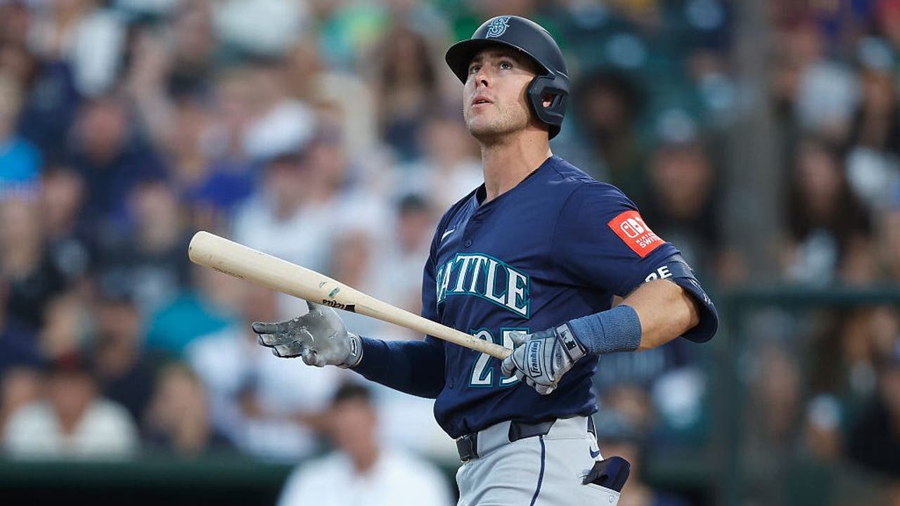 SACRAMENTO, CALIFORNIA - JULY 28: Dylan Moore #25 of the Seattle Mariners looks on while at bat against the Athletics at Sutter Health Park on July 28, 2025 in Sacramento, California. (Lachlan Cunningham / Getty Images)