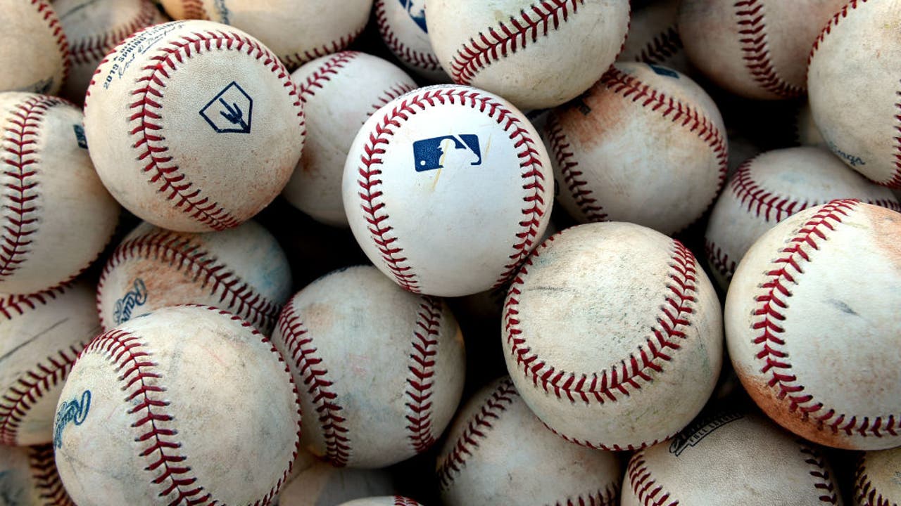 A detail shot of the MLB logo on batting practice balls before the game against the Peoria Javelinas and the Mesa Solar Sox at Sloan Park on Saturday, Sept. 21, 2019 in Mesa, Arizona. (Photo by Jill Weisleder/MLB Photos via Getty Images)