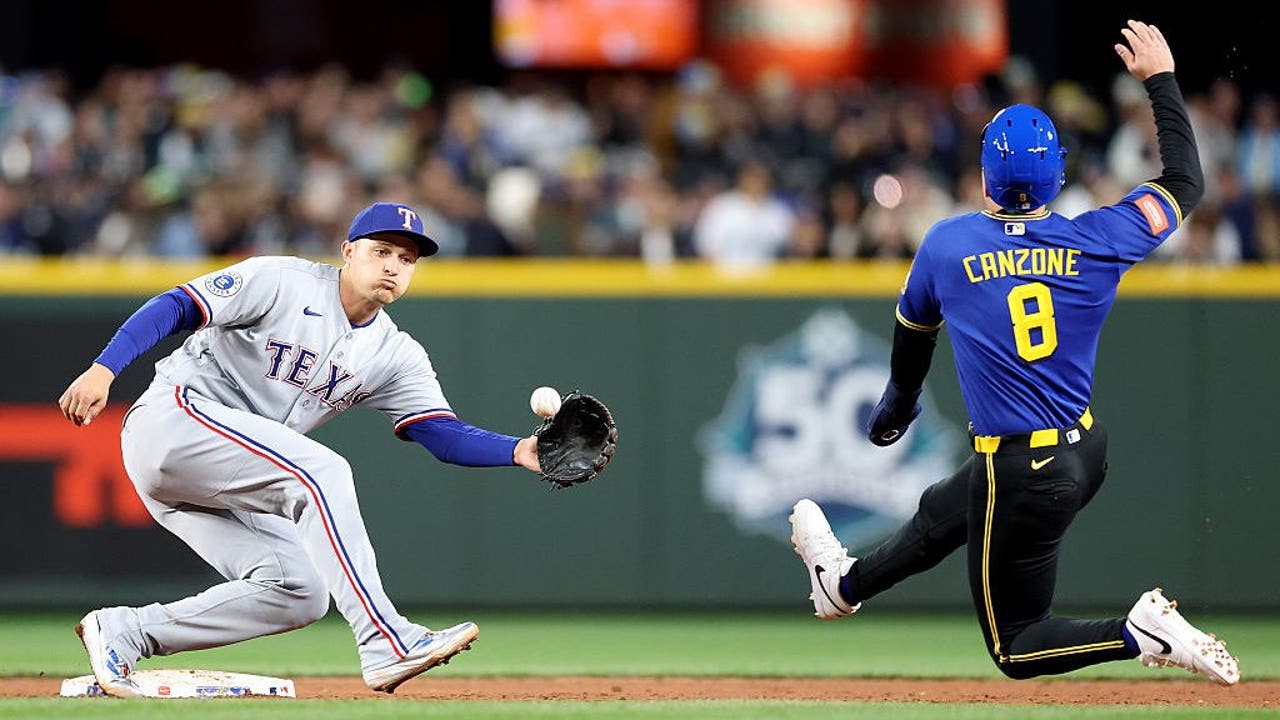 SEATTLE, WASHINGTON - APRIL 17: Corey Seager #5 of the Texas Rangers tags out Dominic Canzone #8 of the Seattle Mariners during the fourth inning at T-Mobile Park on April 17, 2026 in Seattle, Washington. (Steph Chambers / Getty Images)