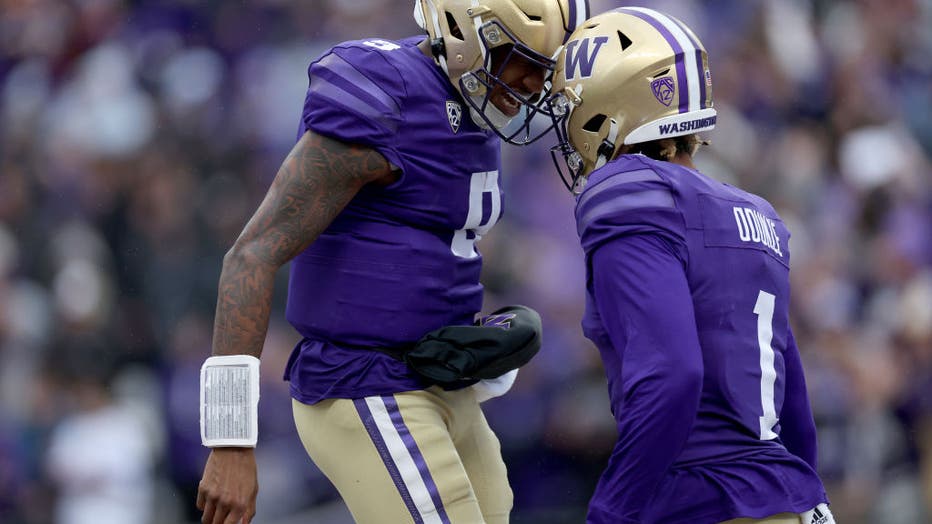 SEATTLE, WASHINGTON - NOVEMBER 11: Michael Penix Jr. #9 and Rome Odunze #1 of the Washington Huskies celebrate their touchdown against the Utah Utes during the third quarter at Husky Stadium on November 11, 2023 in Seattle, Washington. (Photo by Step