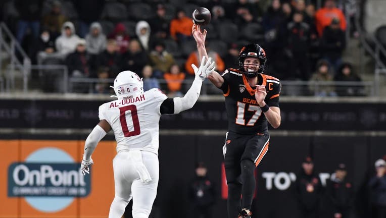 CORVALLIS, OR - NOVEMBER 23: Oregon State Beavers quarterback Ben Gulbranson (17) throws over Washington State Cougars linebacker Taariq Al-Uqdah (0) during a college football game between the Washington State Cougars and Oregon State Beavers on Nove (Brian Murphy / Icon Sportswire / Getty Images)