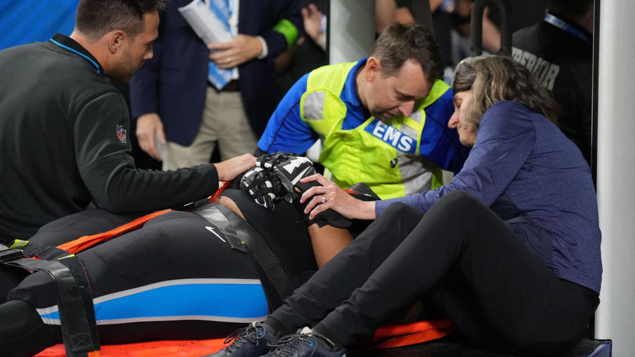 DETROIT, MICHIGAN - OCTOBER 08: Medical personnel attend to Chandler Zavala #62 of the Carolina Panthers after he was injured in the first quarter against the Detroit Lions at Ford Field on October 08, 2023 in Detroit, Michigan. (Photo by Rey Del Rio