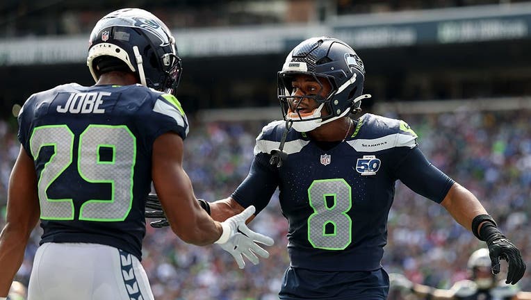 SEATTLE, WASHINGTON - SEPTEMBER 07: Josh Jobe #29 and Coby Bryant #8 of the Seattle Seahawks celebrate an incomplete pass against the San Francisco 49ers during the NFL 2025 game between San Francisco 49ers and Seattle Seahawks at Lumen Field on Sept (Steph Chambers / Getty Images)