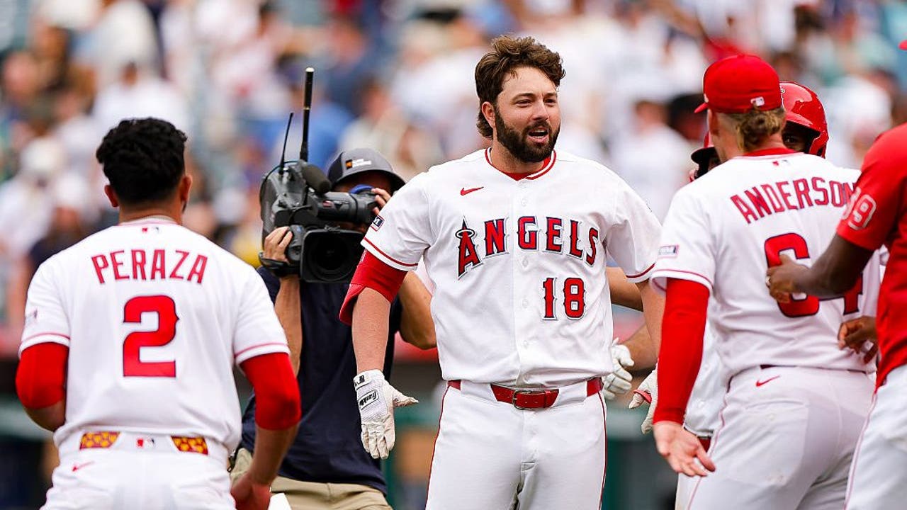 ANAHEIM, CALIFORNIA - APRIL 05: Nolan Schanuel #18 of the Los Angeles Angels celebrates after hitting a walk off sacrifice fly to score Adam Frazier #20 during the eleventh inning of a baseball game against the Seattle Mariners at Angel Stadium of An (Ryan Sirius Sun / Getty Images)