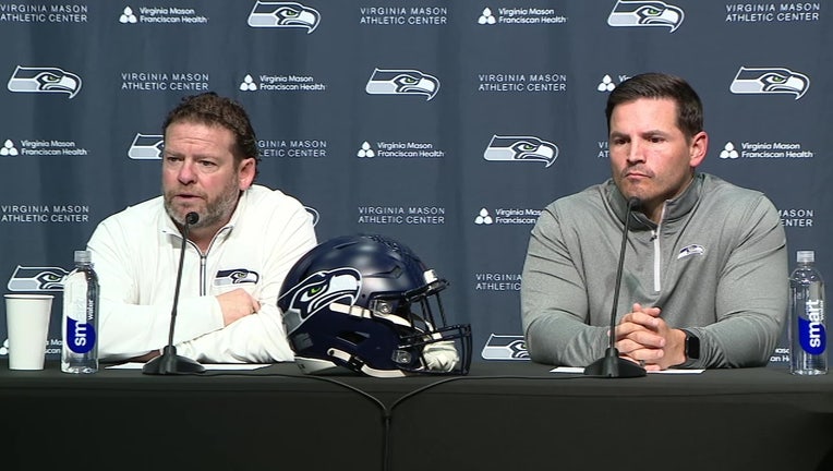 Seattle Seahawks President of Football Operations and General Manager John Schneider and head coach Mike Macdonald speak with reporters on April 20, 2026 at the Virginia Mason Athletic Center ahead of the 2026 NFL Draft. (Byrin Miller / FOX 13 Seattle)