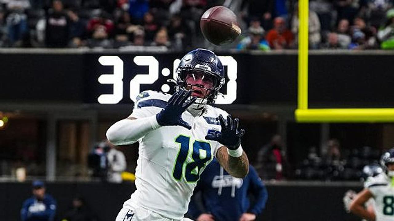 ATLANTA, GEORGIA - DECEMBER 07: Elijah Arroyo #18 of the Seattle Seahawks warms up prior to an NFL football game against the Atlanta Falcons at Mercedes-Benz Stadium on December 7, 2025 in Atlanta, Georgia. (Perry Knotts / Getty Images)