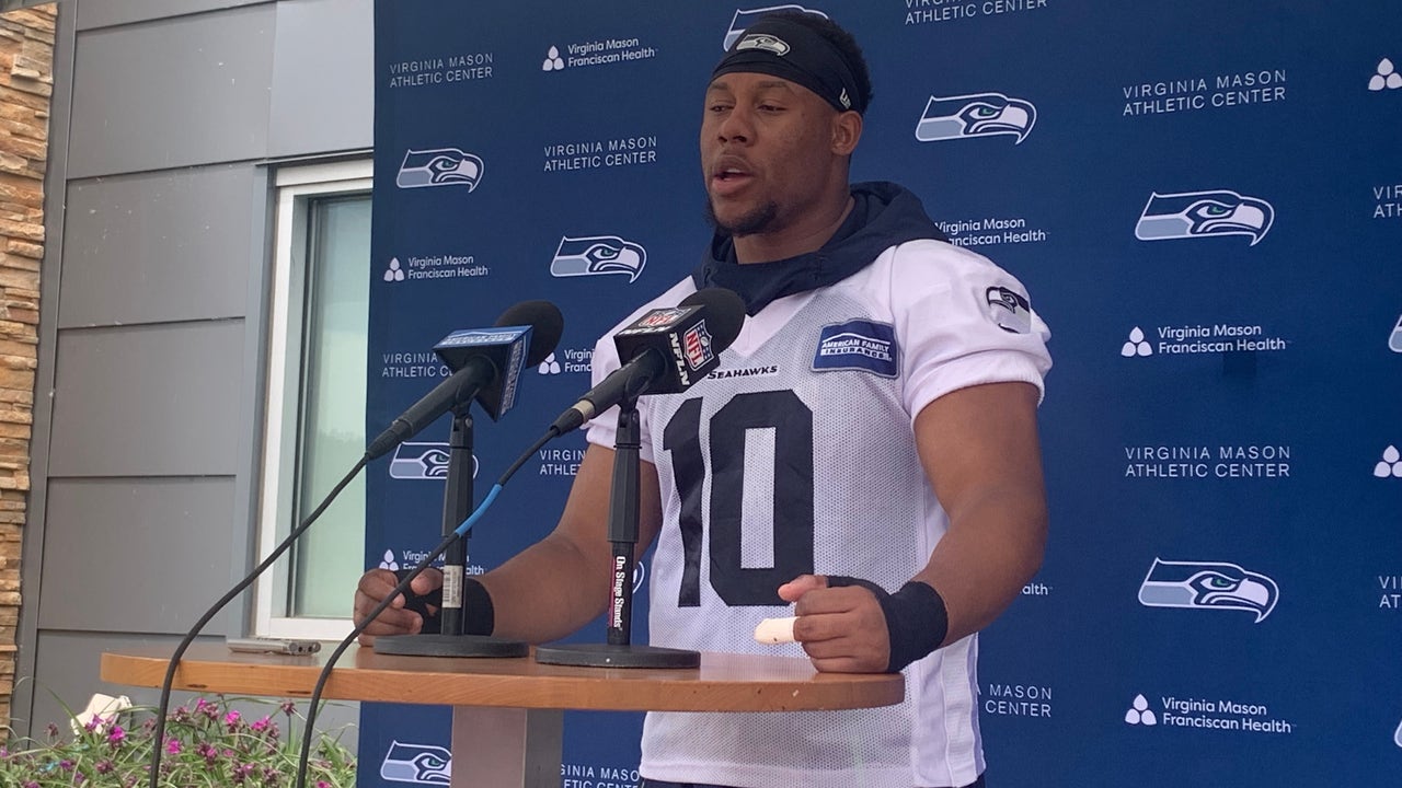 Seahawks linebacker Uchenna Nwosu speaks with reporters after a practice at the Virginia Mason Athletic Center in Renton, Wash. on June 2, 2022. (photo by Curtis Crabtree / FOX 13 Seattle)