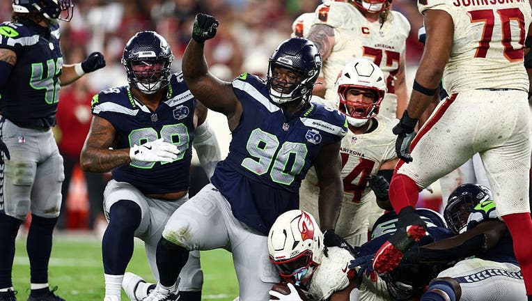 GLENDALE, ARIZONA - SEPTEMBER 25: Jarran Reed #90 of the Seattle Seahawks reacts during the game against the Arizona Cardinals at State Farm Stadium on September 25, 2025 in Glendale, Arizona. (Kevin Sabitus / Getty Images)