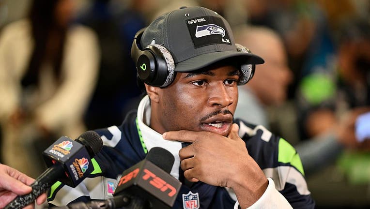 SAN JOSE, CALIFORNIA - FEBRUARY 04: Nick Emmanwori #3 of the Seattle Seahawks speaks to the media ahead of Super Bowl LX at the San Jose Convention Center on February 04, 2026 in San Jose, California. (Eakin Howard / Getty Images)