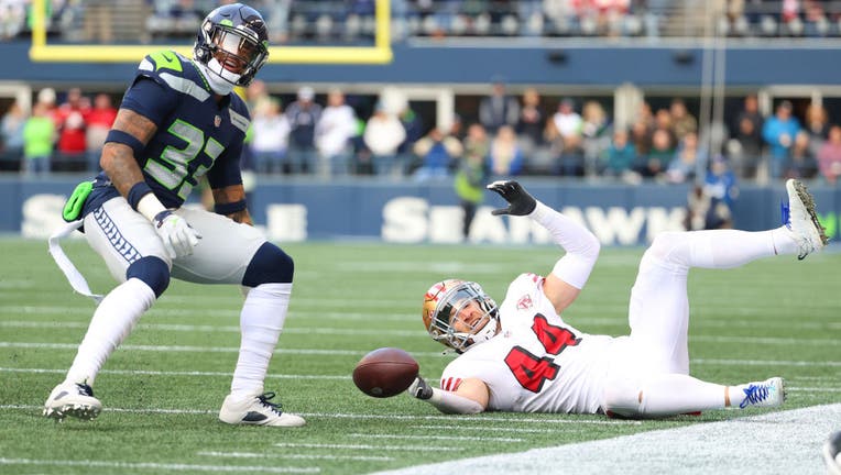 SEATTLE, WASHINGTON - DECEMBER 05: Kyle Juszczyk #44 of the San Francisco 49ers is unable to complete a catch against Jamal Adams #33 of the Seattle Seahawks during the first quarter at Lumen Field on December 05, 2021 in Seattle, Washington. (Photo