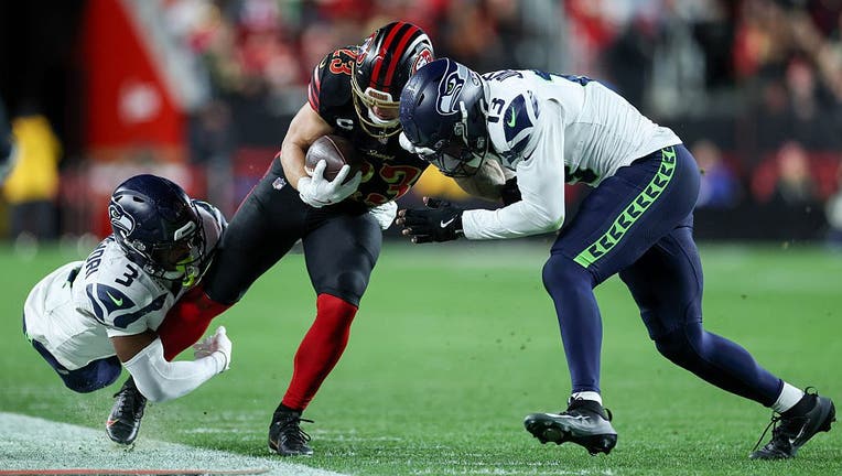 SANTA CLARA, CALIFORNIA - JANUARY 03: Christian McCaffrey #23 of the San Francisco 49ers carries the ball against the Seattle Seahawks during the second quarter of a game at Levi's Stadium on January 03, 2026 in Santa Clara, California. (Ezra Shaw / Getty Images)
