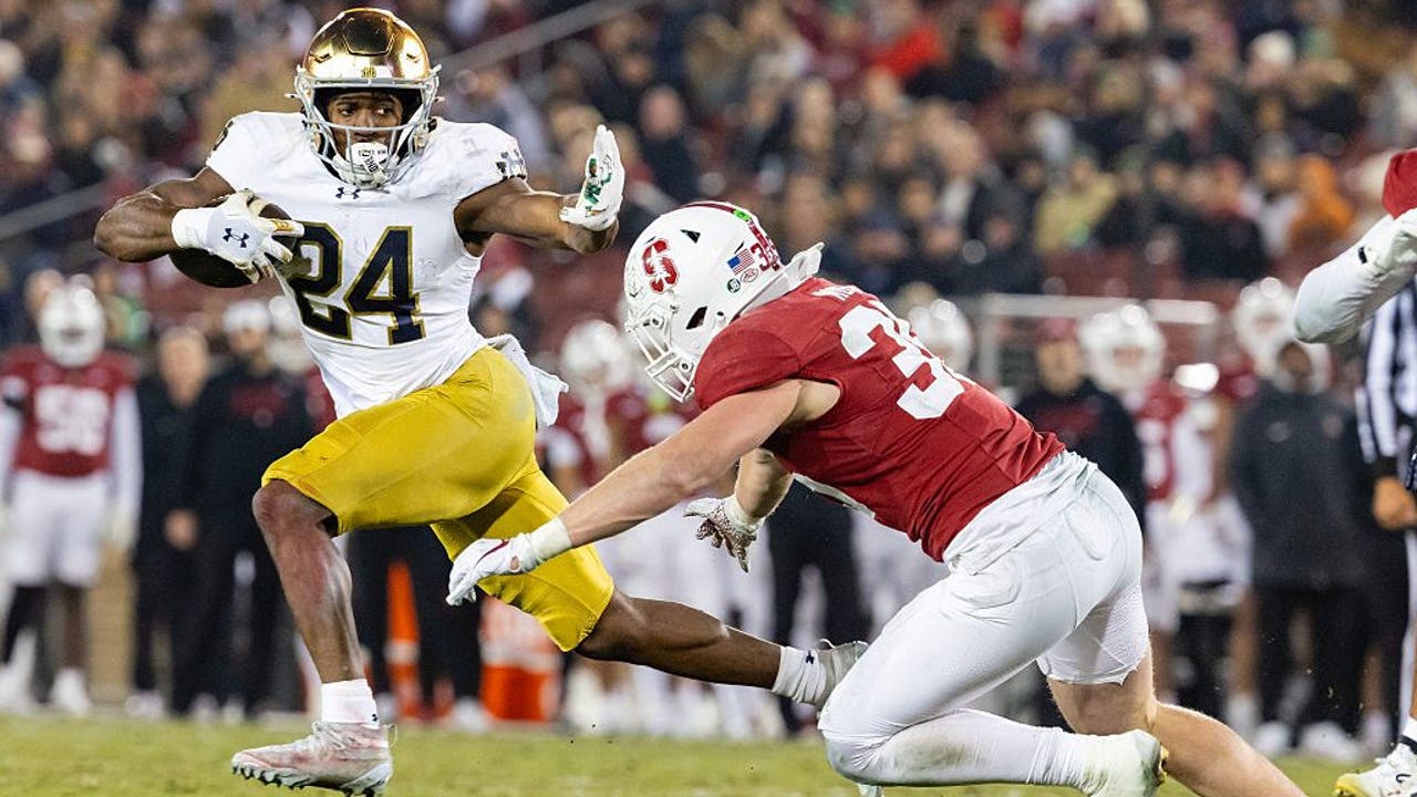PALO ALTO, CA - NOVEMBER 29: Jadarian Price #24 of the Notre Dame Fighting Irish stiff arms Matt Rose #35 of the Stanford Cardinal during a game on November 29, 2025 at Stanford Stadium in Palo Alto, CA. (Matthew Huang / Icon Sportswire / Getty Images)