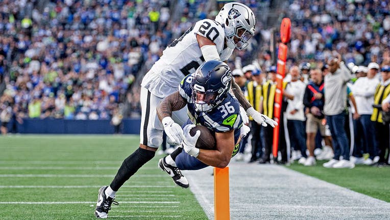 SEATTLE, WASHINGTON - AUGUST 7: George Holani #36 of the Seattle Seahawks dives for a touchdown during the first quarter of the NFL Preseason 2025 game against the Las Vegas Raiders at Lumen Field on August 7, 2025 in Seattle, Washington. (Jane Gershovich / Getty Images)