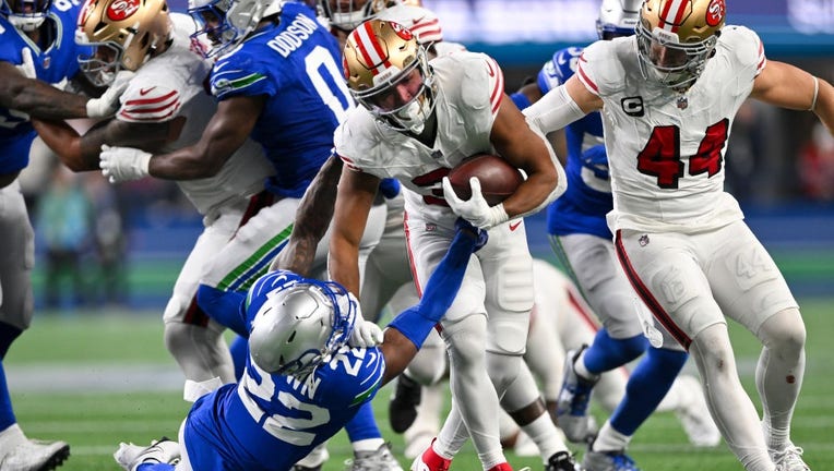 SEATTLE, WASHINGTON - OCTOBER 10: Isaac Guerendo #31 of the San Francisco 49ers runs the ball against Tre Brown #22 of the Seattle Seahawks during the game at Lumen Field on October 10, 2024 in Seattle, Washington. The San Francisco 49ers won 36-24. (Alika Jenner / Getty Images)