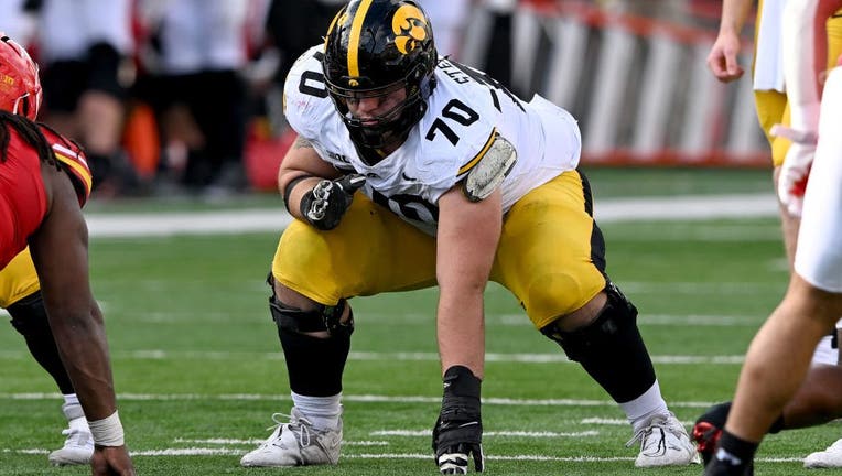 COLLEGE PARK, MARYLAND - NOVEMBER 23: Beau Stephens #70 of the Iowa Hawkeyes blocks against the Maryland Terrapins at Capital One Field at Maryland Stadium on November 23, 2024 in College Park, Maryland. (G Fiume / Getty Images)