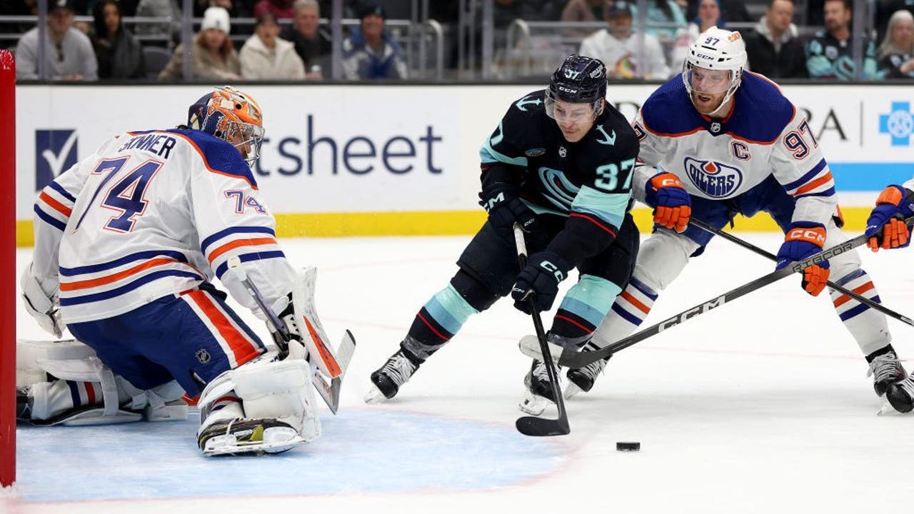 But they didn't have to wait much longer to break through. Will Borgen broke up a Draisaitl pass on a rush chance, but it fell directly to Connor McDavid at the top of Seattle's zone. Draisaitl got lost by the Kraken defense amid the redirected puck and McDavid found him open in the right circle for a one-time blast by Grubauer to give the Oilers a 1-0 lead.