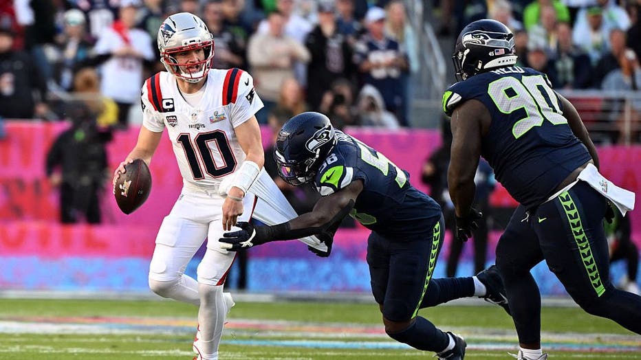 Seattle Seahawks' linebacker #58 Derick Hall (C) pulls the undershirt of New England Patriots' quarterback #10 Drake Maye during Super Bowl LX between the New England Patriots and the Seattle Seahawks at Levi's Stadium in Santa Clara, California on F (Josh Edelson / AFP / Getty Images)