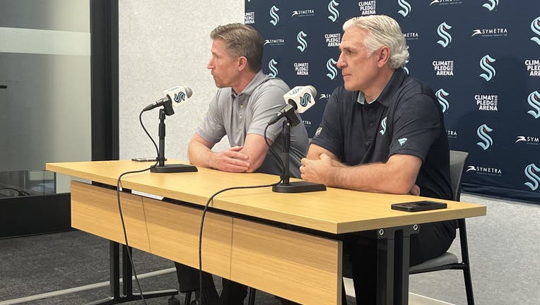 Head coach Dave Hakstol (left) and general manager Rob Francis (right) of the Seattle Kraken speak with reporters at their season ending press conference on May 18, 2023. (photo by Curtis Crabtree / FOX 13)