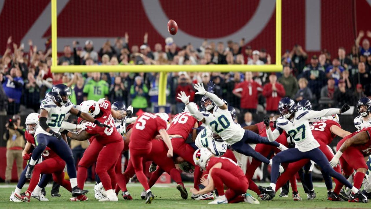GLENDALE, ARIZONA - JANUARY 07: Matt Prater #5 of the Arizona Cardinals attempts a field goal during the fourth quarter against the Seattle Seahawks at State Farm Stadium on January 07, 2024 in Glendale, Arizona. (Photo by Christian Petersen/Getty Im