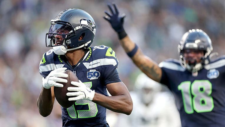 SEATTLE, WASHINGTON - AUGUST 07: Tory Horton #15 of the Seattle Seahawks celebrates his touchdown during the NFL Preseason 2025 game between Las Vegas Raiders and Seattle Seahawks at Lumen Field on August 07, 2025 in Seattle, Washington. (Steph Chambers / Getty Images)
