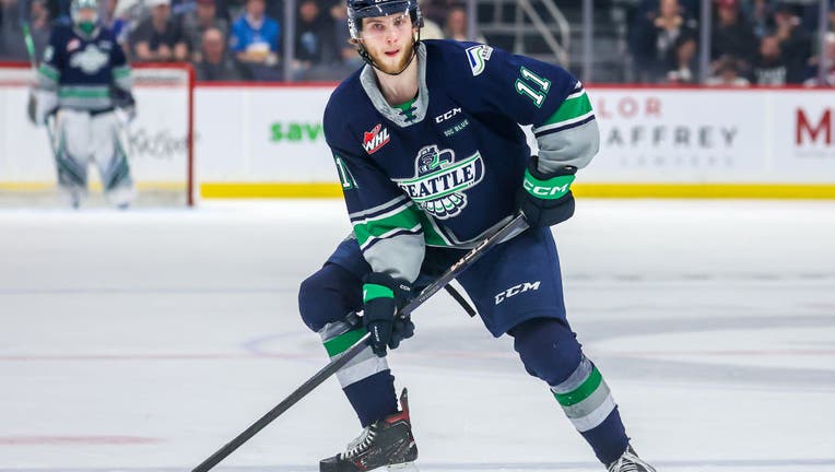WINNIPEG, CANADA - MAY 12: Brad Lambert #11 of the Seattle Thunderbirds plays the puck during first period action against the Winnipeg ICE in Game One of the 2023 WHL Championship Series at Canada Life Centre on May 12, 2023 in Winnipeg, Manitoba, Ca