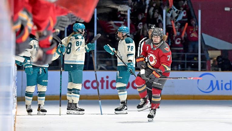 OTTAWA, ONTARIO - MARCH 04: Fanuza Kadirova #71 of the Ottawa Charge skates to celebrate with the bench after scoring against Seattle Torrent during the first period at The Arena at TD Place on March 04, 2026 in Ottawa, Ontario, Canada. (Troy Parla / Getty Images)