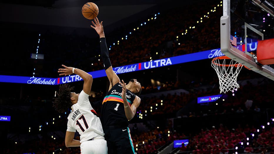 SAN ANTONIO, TX - APRIL 19: Victor Wembanyama #1 of the San Antonio Spurs blocks the shot of Shaedon Rupert #17 of the Portland Trailblazers in the first half of Game One of the Western Conference First Round NBA Playoffs at Frost Bank Center on Apri